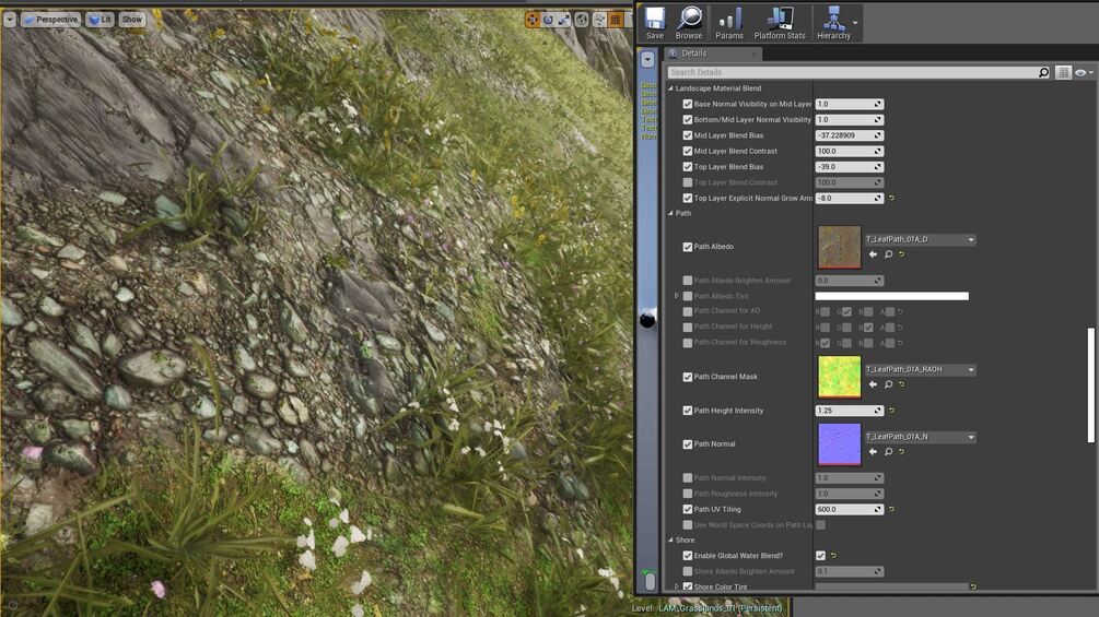 -Top Layer (Grass in the example) macro-variation masks give you the ability to have two types of material on one layer, and spawn procedural foliage on both. Useful for flower variations, etc